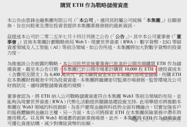 战略布局早有预兆。云锋金融为进军数字货币领域做了充分准备,不仅委任复星集团联合创始人梁信军担任独立非执行董事——梁信军在Web3区块链、人工智能和元宇宙等领域拥有丰富投资经验;还早在7月份就公布了将虚拟资产纳入财务战略的规划。9月2日,云锋金融公告已在公开市场累计购买1万枚以太币,总投资成本达4400万美元。这些举措表明云锋金融对虚拟资产领域的投入是全面而深入的,绝非短期炒作。