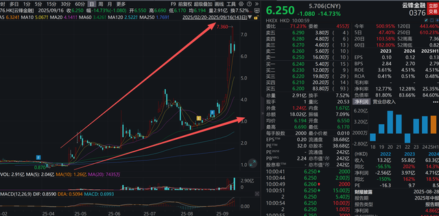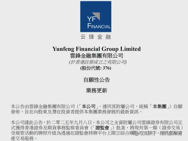 2025年9月15日,云锋金融交易大厅内的电子屏上闪烁着令人惊叹的数字:单日涨幅近20%,月内累计涨幅突破120%,今年4月28日以来,不到五个月已经涨幅约400%。这场资本狂欢的催化剂源自香港证监会在9月8日的一纸批文——云锋证券成功获批升级第一类牌照。