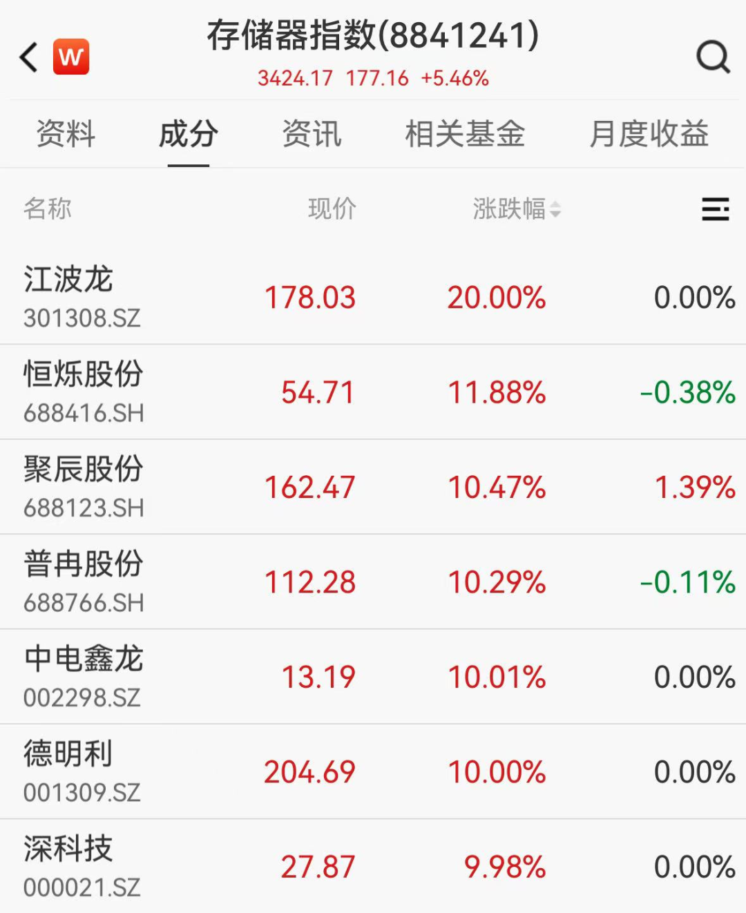 9月30日,根据Wind统计,“存储器”板块领跑市场,截至收盘,存储器指数上涨5.46%,多只个股涨停。