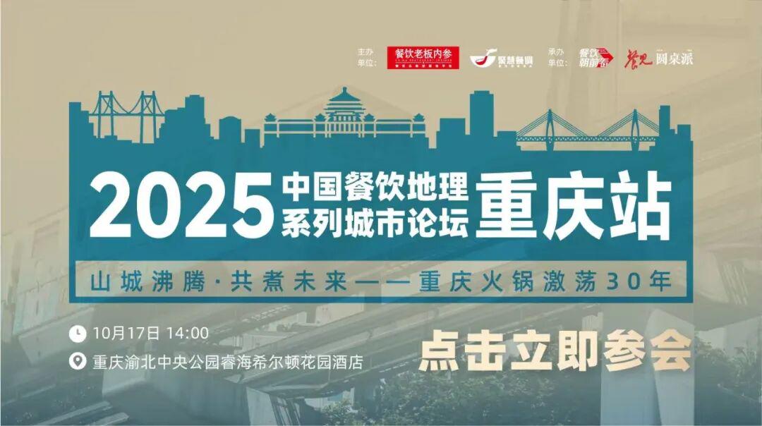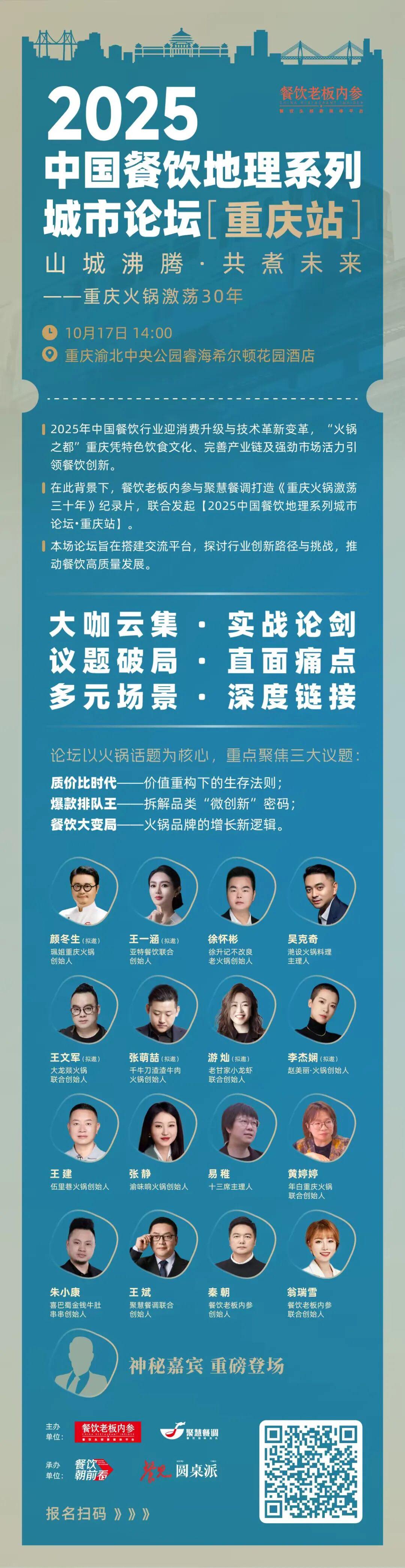 中国餐饮地理系列城市论坛·重庆站——山城沸腾·共煮未来,由餐饮老板内参联合聚慧餐调共同主办,采用高规格闭门会形式,聚焦一线品牌掌门人,以“小范围 × 高密度 × 强反馈”为核心,围绕“品类创新与增长密码”进行深度解析与真诚交锋。