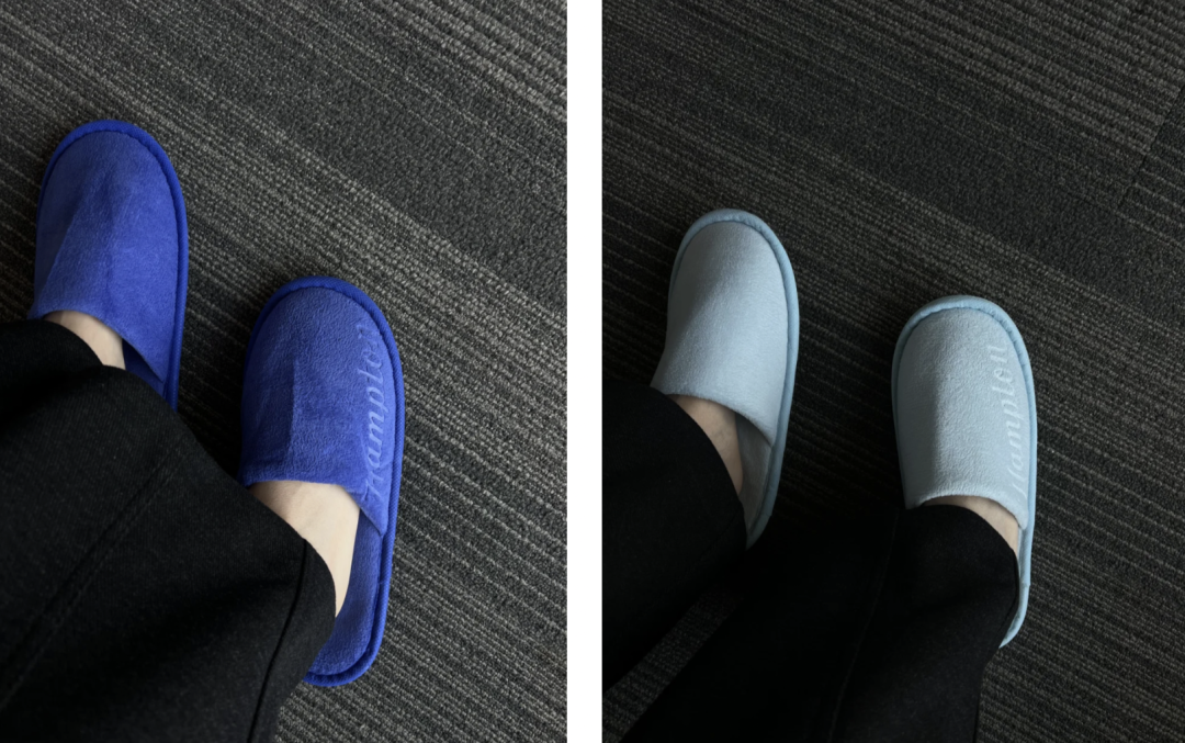 除了材质和质感外,希尔顿欢朋的酒店拖鞋甚至还卷起了颜值,分为克莱因蓝和薄荷绿两款,也为潜在的顾客提供了更多入住的理由。