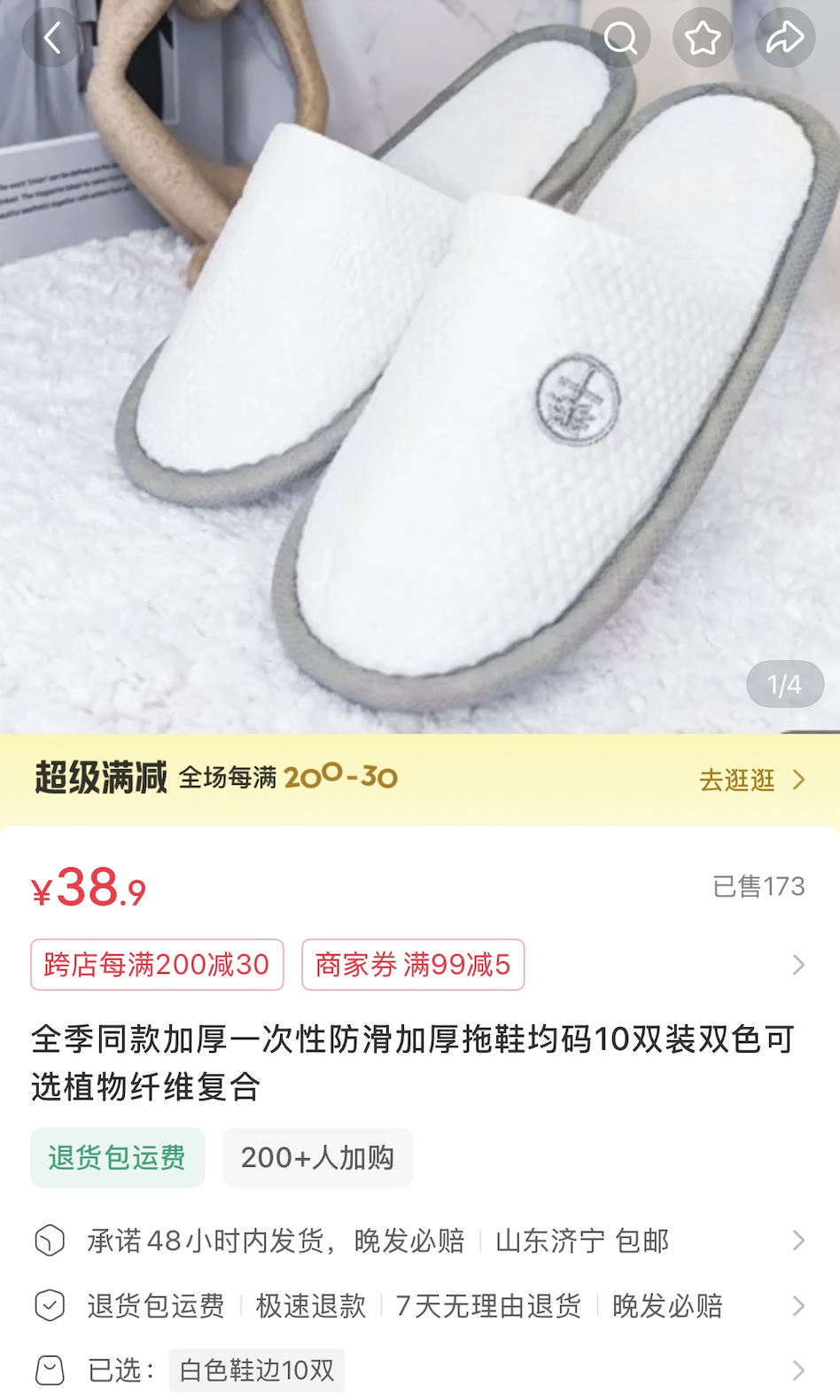氢商业查询到,市面上已经有号称“百分百植物纤维可降解”的拖鞋,零售均价3.89元/双,经咨询后对方表示一万双以上的采购价可以降至2.5元/双,甚至低于在高端酒店拖鞋3-6元的常见价格区间。