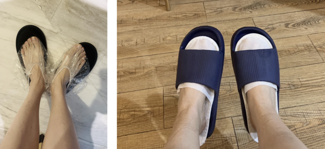 为了不再“步步惊心”,房客们也是八仙过海、各显神通。有人自备拖鞋,有人给拖鞋套上浴帽,还有人将一次性拖鞋与塑料拖鞋叠穿,“给拖鞋穿拖鞋”,试图解决卫生和防滑的两大难题,也有人进房间就先烧开水,用开水把浴室地面都烫一下,然后再光脚踩上。