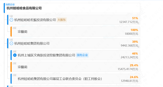 杭州上城区文商旅投资控股集团作为国资代表持有46%的股份,宗馥莉通过继承其父宗庆后持有的29.4%股份已完成工商变更登记。