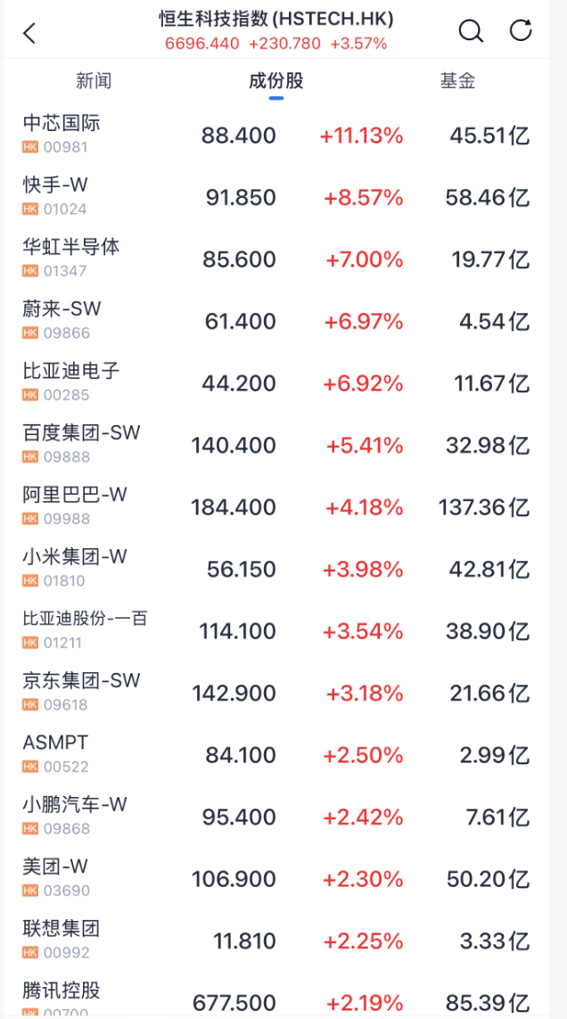 个股方面,中芯国际暴涨超11%,阿里巴巴涨超4%,腾讯涨超2%。