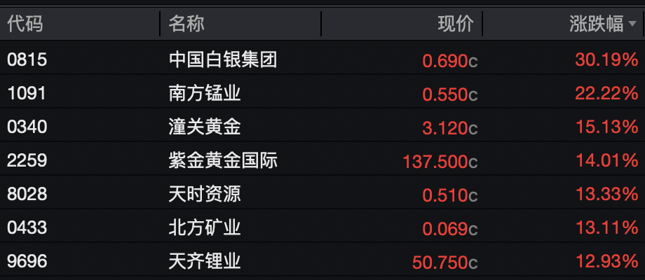 黄金股受金价表现刺激走强,截至收盘,潼关黄金、紫金黄金国际、灵宝黄金分别上涨15.13%、14.01%、10.86%。此外,中国白银集团收涨超30%,南方锰业涨超22%,天齐锂业涨近13%。