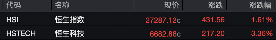 10月2日,港股指数全天震荡上行。截至收盘,恒生指数大涨431.56点,报27287.12点,创2021年7月23日以来最高收盘价,当日涨幅为1.61%;恒生科技指数涨3.36%,报6682.86点,创2021年11月16日以来收盘新高;恒生中国企业指数涨1.77%,报9724.38点。