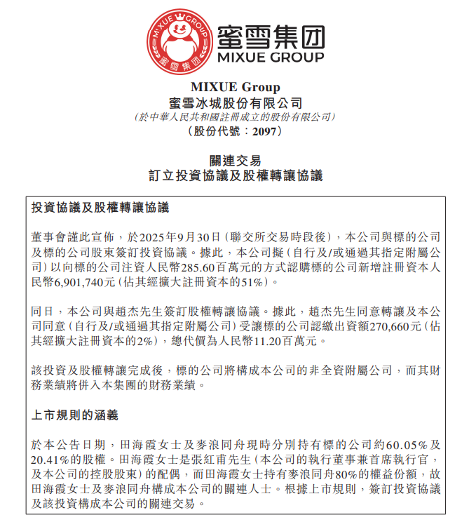 10月1日,蜜雪集团(HK.2097)于香港联交所发布公告,宣布以2.856亿元人民币增资福鹿家(郑州)企业管理有限公司,并以1120万元收购其2%股权,交易完成后合计持股53%。从持股比例看,股权转让完成后,蜜雪集团将成为福鹿家第一大股东。