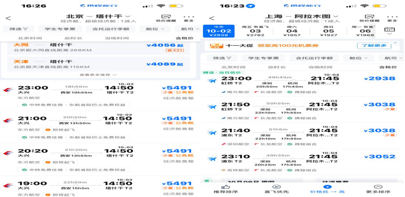 10月3日上海、北京至哈萨克斯坦、乌兹别克斯坦的最低机票价格仍超过2000元