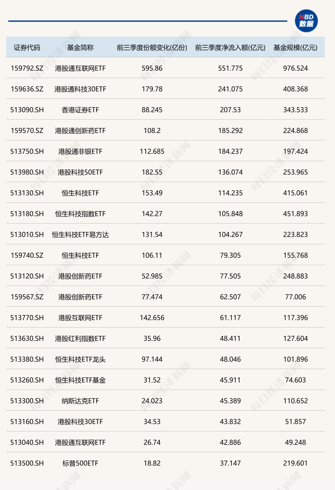 港股通科技30ETF、香港证券ETF紧随其后,前三季度净流入资金均超200亿元。
