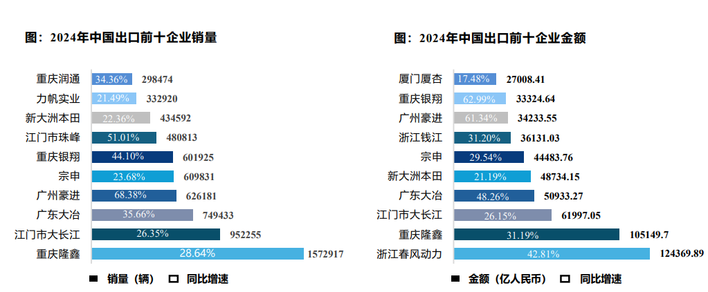 我们举个出口方面的例子,2024年国内出口第一位的重庆隆鑫摩托,出口量为157.3万辆,产品以小排量代步摩托为主,实现出口金额10.5亿美元。