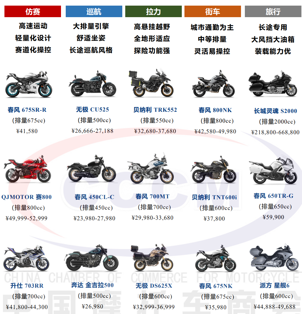 例如:春风动力、钱江、无极摩托(隆鑫)、升仕摩托(大冶)、赛科龙(宗申)、长城灵魂、凯越摩托(珠峰)等品牌,都有不错的大批量车型。