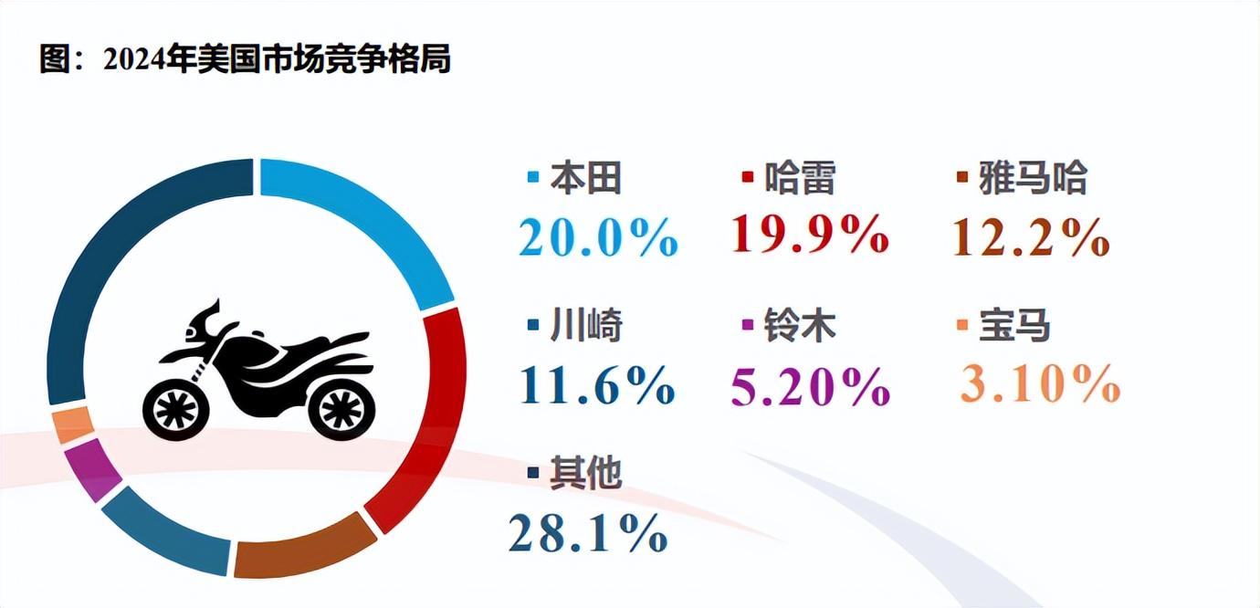 可见,在成熟的美国摩托车市场,本田、哈雷、雅马哈和川崎是最受欢迎的,市场占比都在10%以上。