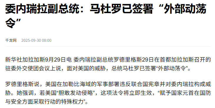 根据最新消息,9月29日,委内瑞拉总统马杜罗已经签署外部动荡令,授权军队接管石油和公共服务,一旦美军穿过边境,委内瑞拉将发起反侵略战争。