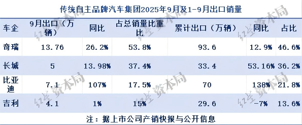 相比其他传统自主品牌车企,奇瑞前三季度累计出口93.6万辆,同比增长12.9%,占总销量的46.6%。长城汽车前三季度累计出口33.4万辆,同比增长53.16%,占总销量的36.2%。比亚迪前三季度累计出口70万辆,同比增长138.1%,占总销量的21.8%。