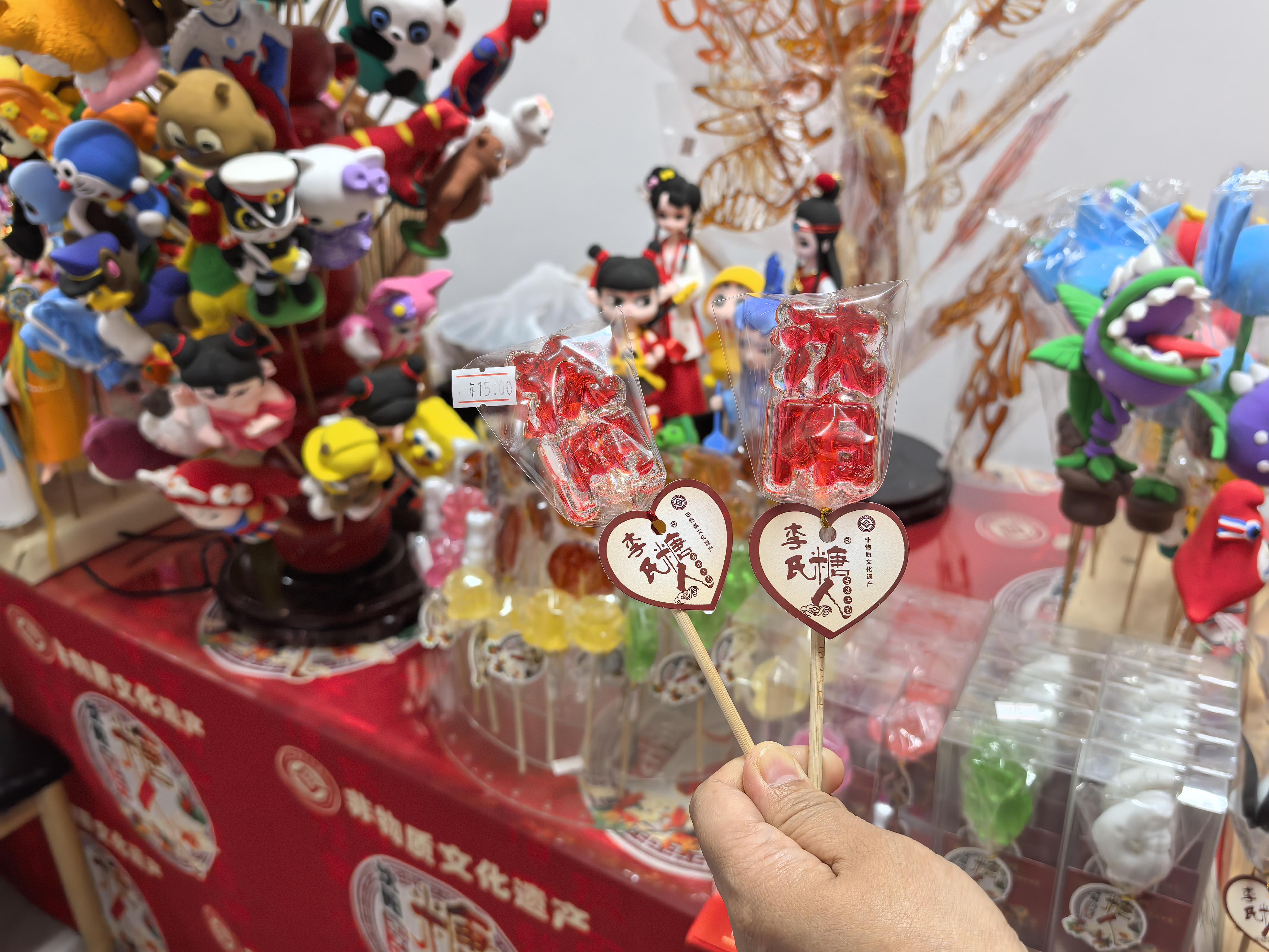 耳朵眼胡同“沈阳李氏糖人”门店工作人员展示为国庆节特意设计的“沈阳”字样棒棒糖。
