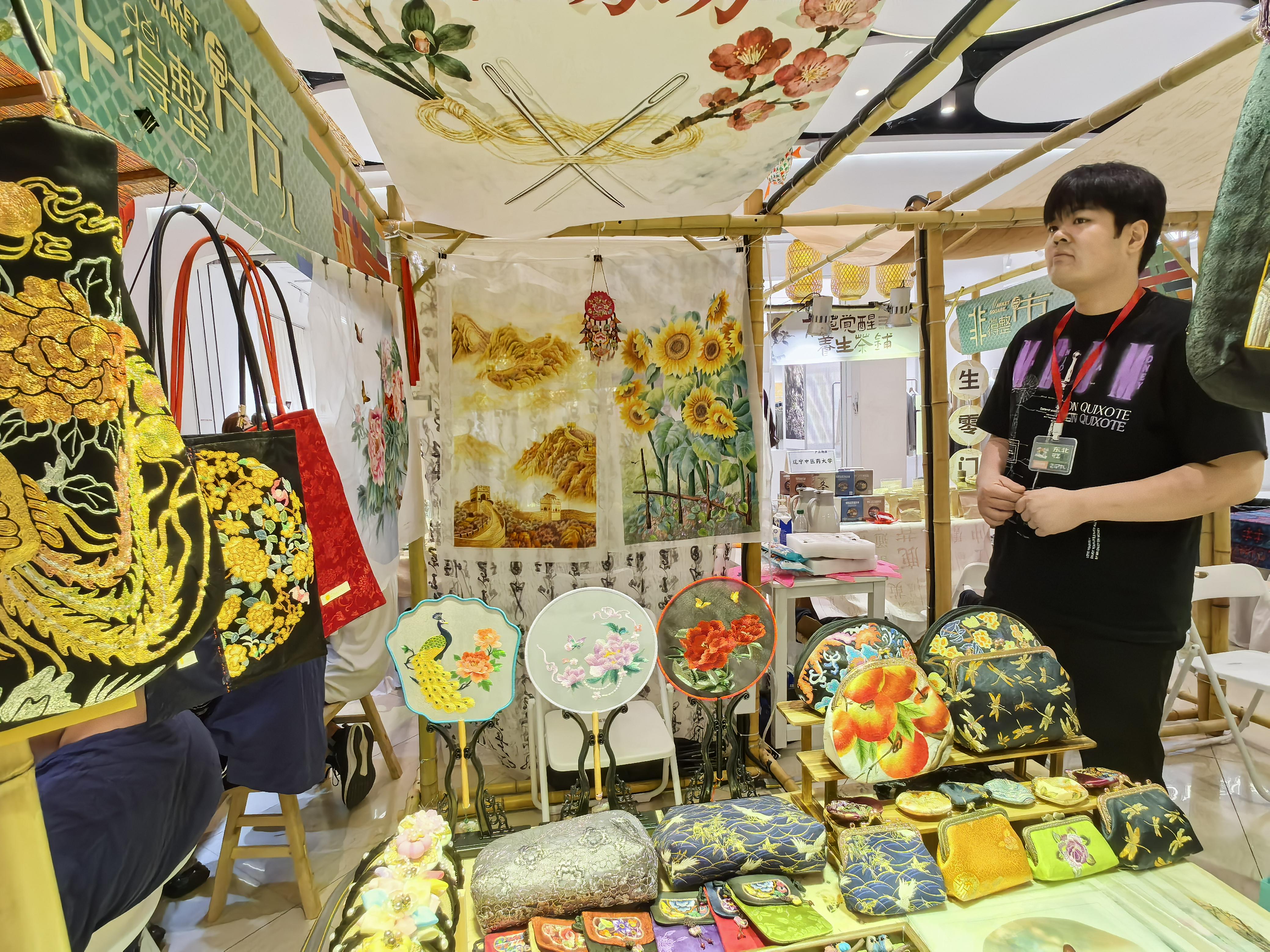在“柒囍手绣坊”展位,工作人员向记者介绍,展位墙上悬挂的长城元素刺绣作品也是在最近完成后特意带到市集的,与国庆的节日氛围非常契合。
