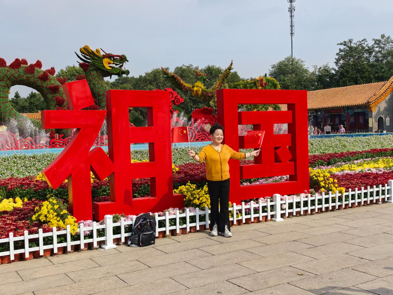 游客与北陵公园正门的“祝福祖国”主题花坛合影。