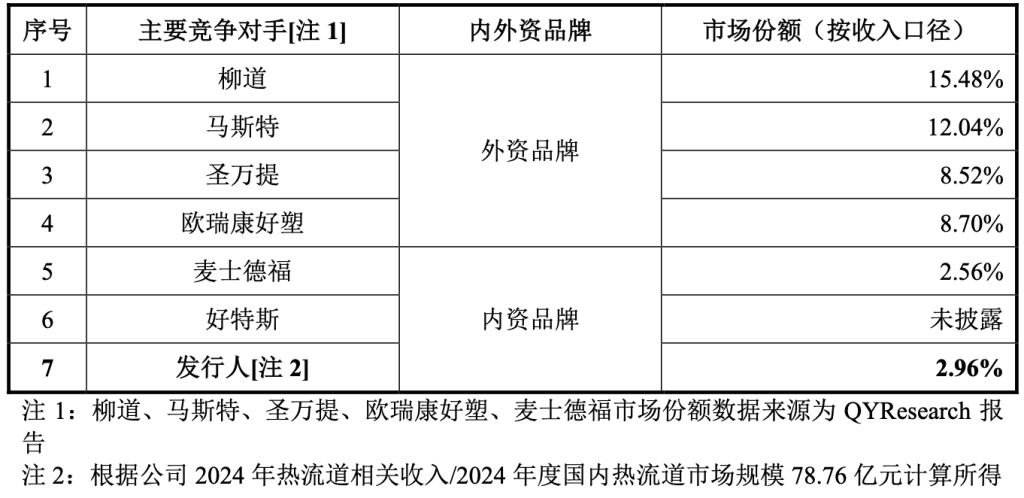 公告显示,在全球热流道市场各应用领域中,以汽车、3C消费电子为主,占比分别为41.80%和20.52%,国内热流道系统的各领域市场份额与全球热流道市场分布基本一致,主要以汽车和3C消费电子为主,占比分别为34.49%和24.65%,其次为家电和包装领域。目前国内热流道市场中柳道、圣万提等外资品牌市场份额占比高达70%-80%,其应用领域覆盖面较广,涉及汽车、家电、3C消费电子等。2024年度,恒道科技在国内占有的市场份额约为2.96%,远低于外资品牌,与主要竞争对手在应用领域以及公司各期前五大客户均存在诸多重叠,虽然各自侧重点有所区别,但总体已形成相互竞争的格局。