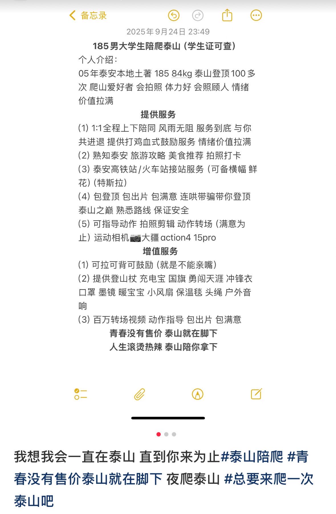 等泰山国庆的人潮散去,陪爬师们手机里的订单提示或许会暂歇,有人刚靠国庆单趟千元的订单赚够了和女朋友的零花钱,有人揉着酸胀的膝盖盘算 “再干俩月就撤”,但也有人在琢磨怎么把 “吃青春饭” 变成能长久的事业。