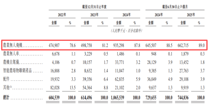 招股书显示,极飞科技主要的收入来源是销售农业无人机,2024年这部分收入占比为87.8%。