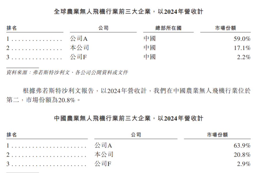 根据弗若斯特沙利文报告,以2024年营收计算,全球农业无人机第一大企业是大疆,第二大是极飞,二者的占比分别为59.0%和17.1%。