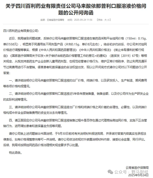 9月24日,云南省医疗保障局官网发布公开《问询函》,将百利药业推上风口浪尖。问询函直指百利药业生产的“降压药”——马来酸依那普利口服溶液(规格:150ml:0.15g)存在“价格异常”。