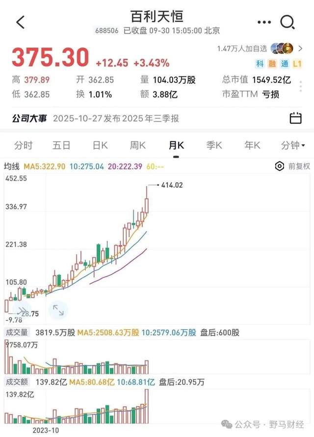 截至9月30日,百利天恒报收375.3元/股,总市值1550亿元。