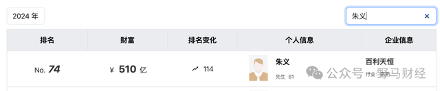 2024年,朱义以510亿元财富值位列《胡润百富榜》第74名。