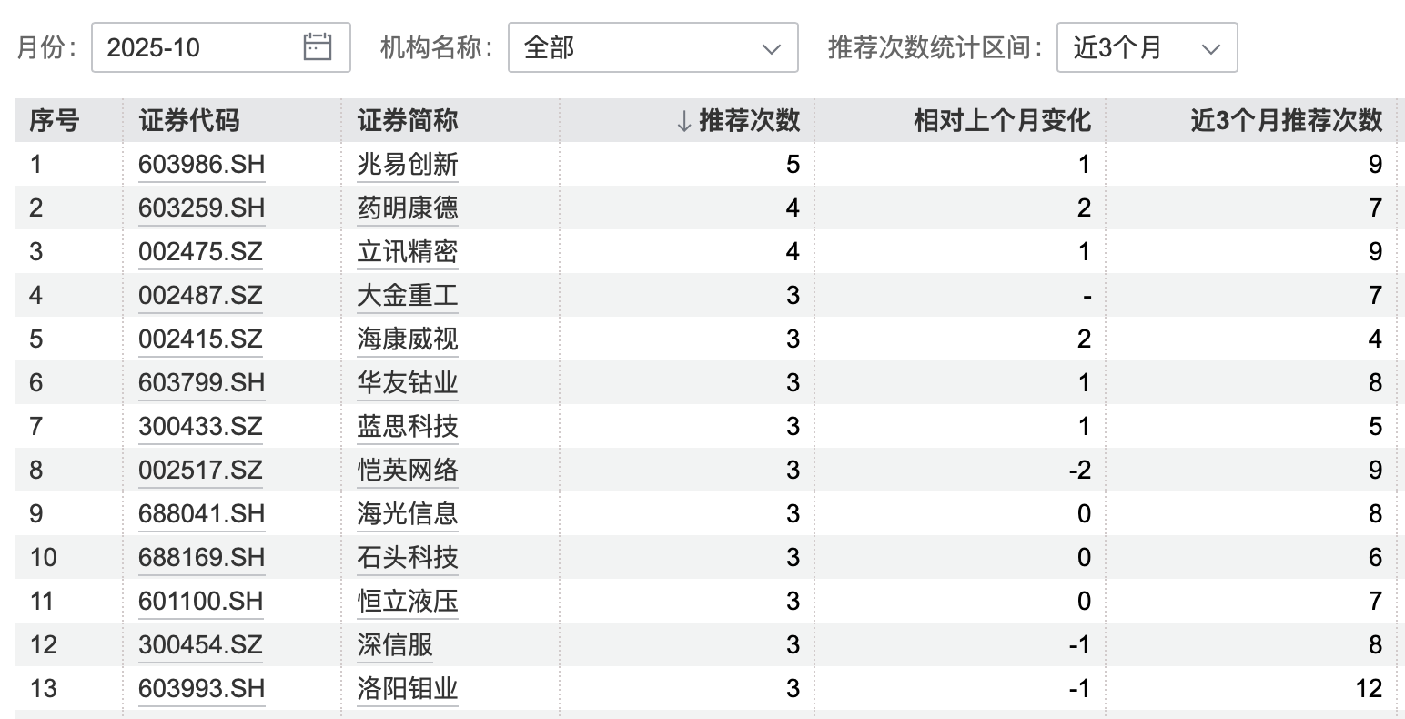 Wind数据显示,目前已有26家券商发布了10月金股推荐,共计推荐了196只股票。其中,兆易创新、立讯精密、药明康德被推荐次数居前。金股榜靠前股票中,约半数属于信息技术相关行业,如海康威视、蓝思科技、海光信息、恺英网络、深信服等。