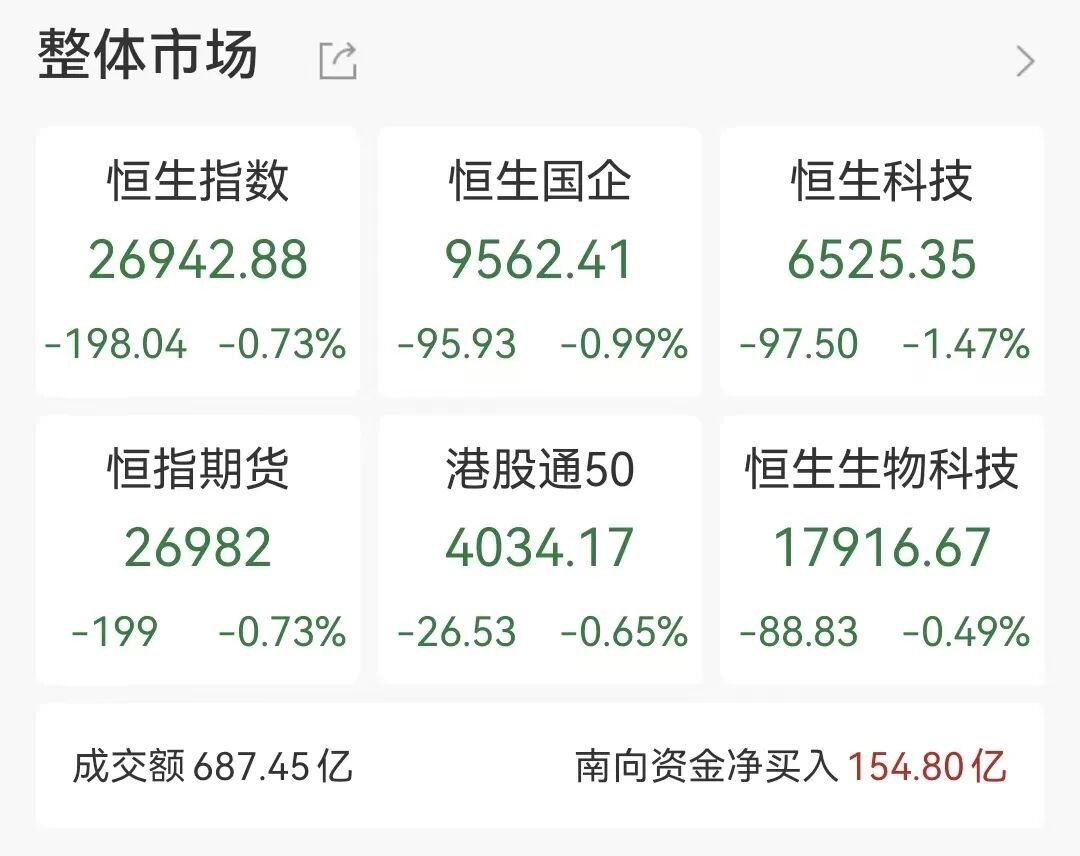 10月6日,港股三大指数调整,截至11:44,恒生指数跌0.73%,恒生科技指数跌1.47%,恒生中国企业指数跌0.99%。