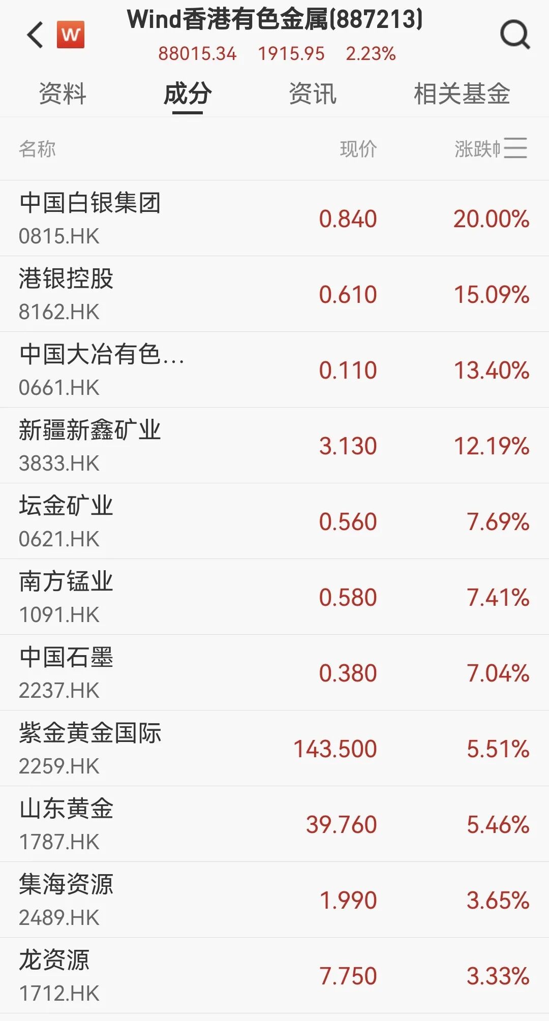 现货黄金、国际金价创新高,黄金股乘势扩大涨幅,中国白银狂飙20%,紫金黄金国际涨超5%。