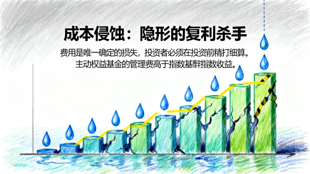 主动权益基金的管理费高于指数基金,在长期复利下会吞噬相当部分的最终收益。