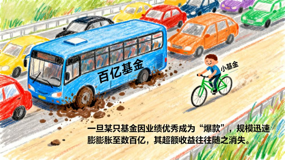 一旦某只基金因业绩优秀成为“爆款”,规模迅速膨胀至数百亿,其超额收益往往随之消失。