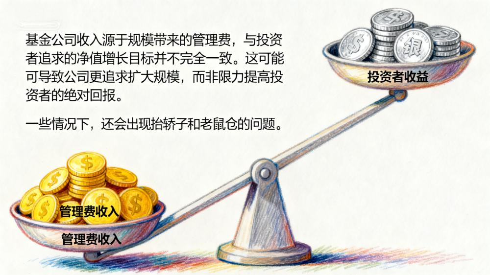 基金公司收入源于管理费(规模驱动),与投资者追求的净值增长目标并不完全一致。