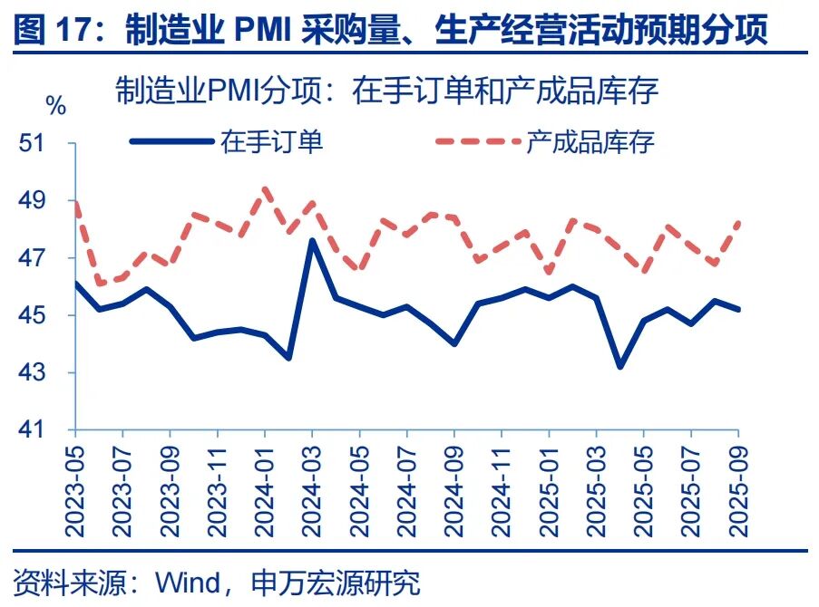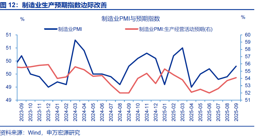 制造业方面,9月PMI积极改善,结构上呈现生产指数修复好于新订单的格局。9月制造业PMI较前月回升0.4pct至49.8%,整体符合季节性。从主要分项看,价格指数保持韧性下,生产指数升至近6个月高点(51.9%),较前月上行1.1pct,明显好于季节性(0.3pct)。生产走强带动企业加快原材料采购,采购量指数回升1.2pct至51.6%。而新订单指数回升幅度不及往年同期(0.5pct),较前月仅上行0.2pct至49.7%。