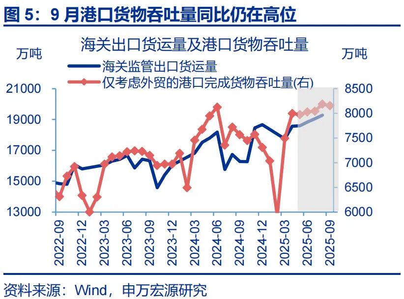 需求结构延续外需好于内需的态势,表现为新出口订单回升幅度大于内需订单。拆分需求结构看,9月,新出口订单指数(+0.6pct至47.8%)上行幅度明显好于内需订单(+0.1pct至50%)。今年以来,外需改善叠加中国在新兴市场的份额提升,支撑出口持续超预期;高频指标显示,9月外贸货运量同比上行1.8pct至7.8%,说明出口仍维持韧性。