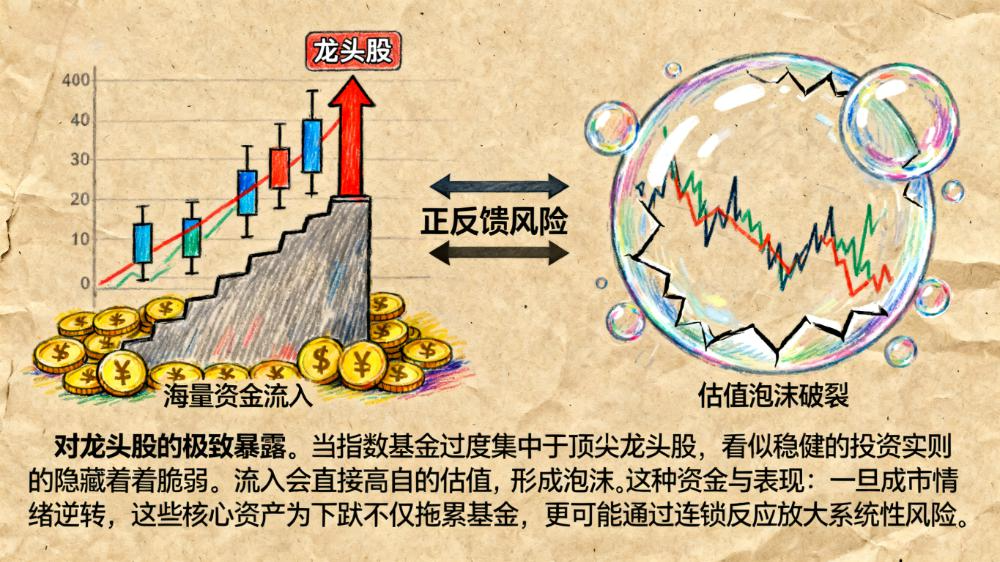 当指数基金过度集中于龙头股,看似稳健的投资实则隐藏着脆弱性。海量资金的流入会直接推高其估值,形成泡沫。