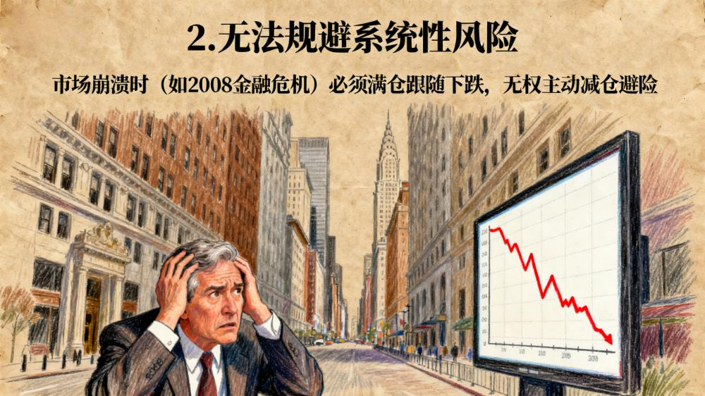 致命弱点:当整个市场崩溃时,指数基金必须满仓跟随指数下跌,没有主动减仓或避险的权利。您只能眼睁睁看着资产缩水。