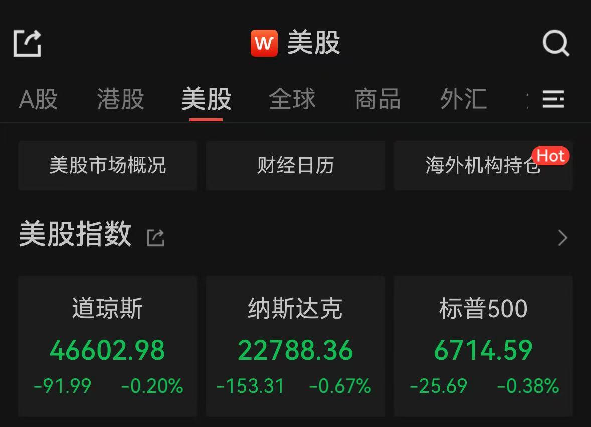 截至收盘,道指跌0.2%报46602.98点,标普500指数跌0.38%报6714.59点,纳指跌0.67%报22788.36点。