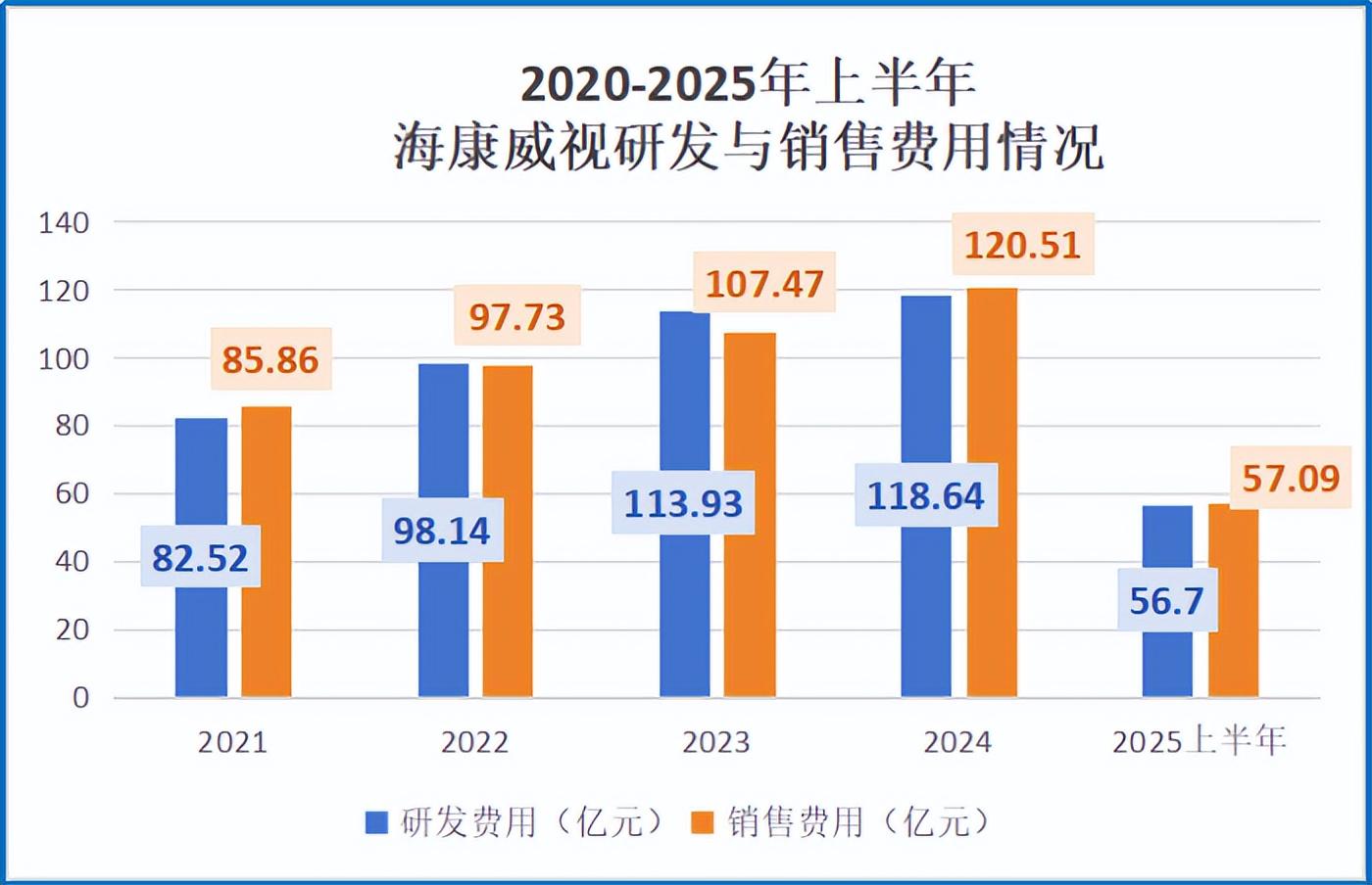 2020-2024年,海康威视研发费用与销售费用几乎持平,后两年每年都分别在100亿元以上,相应费用率超10%,且数据还每年都在上升。