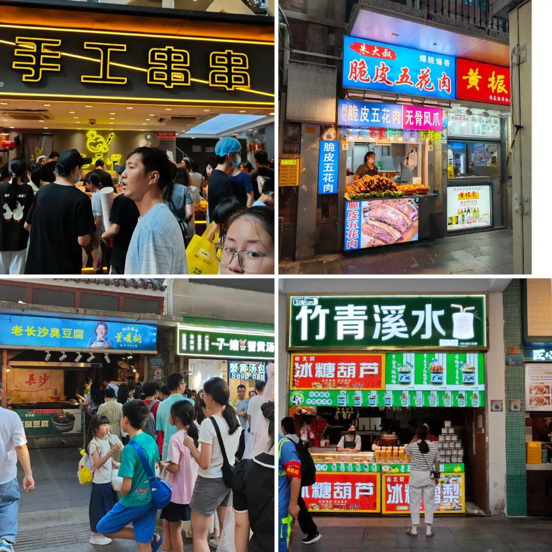 一些景区经典小吃门口也都热闹非凡,比如长沙臭豆腐、手工串串等等。对比之下,一些过期网红如竹筒奶茶则少有人问津。