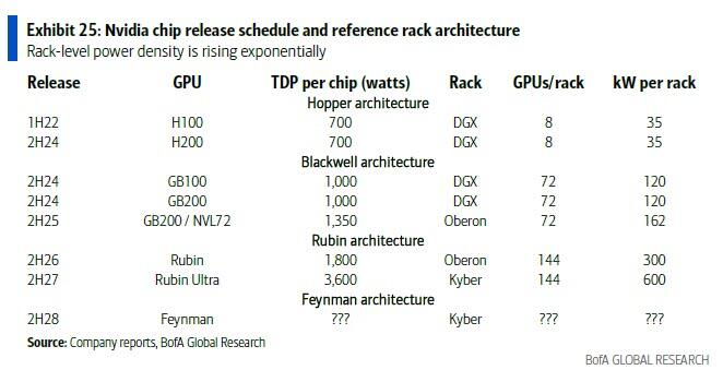直接的连锁反应,是服务器机架功率密度的急剧攀升。在AI训练集群中,网络延迟是性能的致命瓶颈。为最大限度降低GPU之间的数据传输延迟,工程师的解决方案是将尽可能多的GPU紧密集成在同一个服务器机架内,通过高速内部互联(如NVLink)进行通信。这一架构优化的必然结果,就是机架功率密度的爆炸式增长。在2021年,数据中心的平均机架密度尚不足10千瓦(kW);如今,一个标准的英伟达Hopper(H200)机架功耗已达35kW,最新的Blackwell(B200)机架更是高达120kW。根据英伟达公布的路线图,其计划于2027年下半年推出的Rubin Ultra平台,单机架功耗将达到前所未有的600kW。AMD的MI350和未来的MI400,以及英特尔的Gaudi系列,也遵循着同样的轨迹。