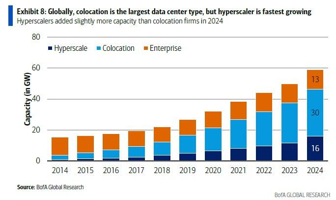 数据中心市场的增长,已不再由传统企业自建自用驱动。自2017年以来,云服务商和托管公司的总容量首次超越企业自建数据中心后,几乎所有的新增容量都来自于两类玩家:以亚马逊AWS、微软Azure为代表的“超大规模”(Hyperscale)云服务商,以及为它们或其它客户提供租赁服务的“托管”(Colocation)公司。