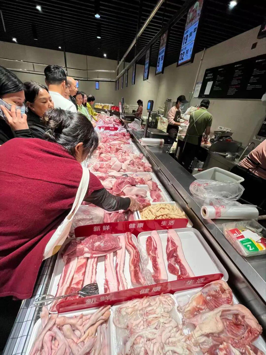 1、猪肉鲜切散卖区——通过现场分割鲜切售卖,带来了生活气息、“工匠精神”与价格表现力,进而成为了肉品区的“堵点”。