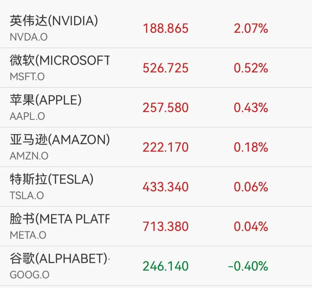 美国科技七巨头普遍走强,其中英伟达涨超2%。