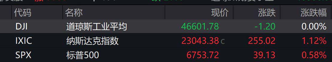 美东时间10月8日16:00(北京时间10月9日04:00),道指收跌1.20点,报46601.78点;纳指收涨255.02点,报23043.38点,涨幅为1.12%,创收盘新高;标普500指数收涨39.13点,报6753.72点,涨幅为0.58%,创收盘新高。纳指、标普500指数盘中最高分别报23045.14点、6755.64点,均创盘中历史新高。