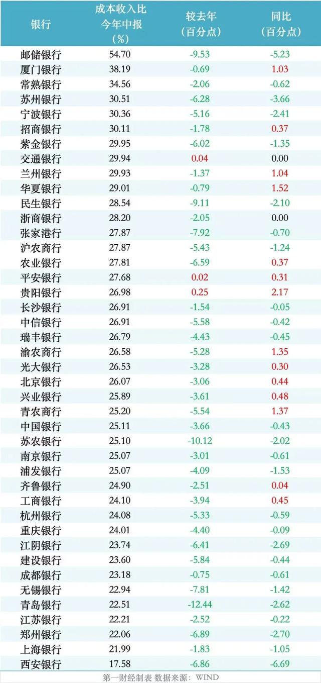 从成本收入比来看,Wind数据显示,相比去年全年,42家上市银行中,交通银行、平安银行、贵阳银行3家上半年成本收入比略增,其余39家上市银行上半年成本收入比均有不同程度下行。其中,苏农银行、青岛银行成本收入比降幅超过10个百分点。