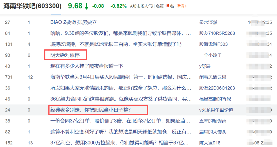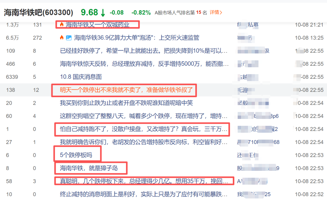 其次,听听股民怎么说?虽然也有股民表示看好,但更多的股民则对总经理本次增持持怀疑态度:海南华铁,又一个双城药业;海南华铁,就是獐子岛。当时双城药业因收购一家半导体公司,而被爆炒成10倍股,然后终止收购后股价暴跌66%,目前更是拉响退市警报。