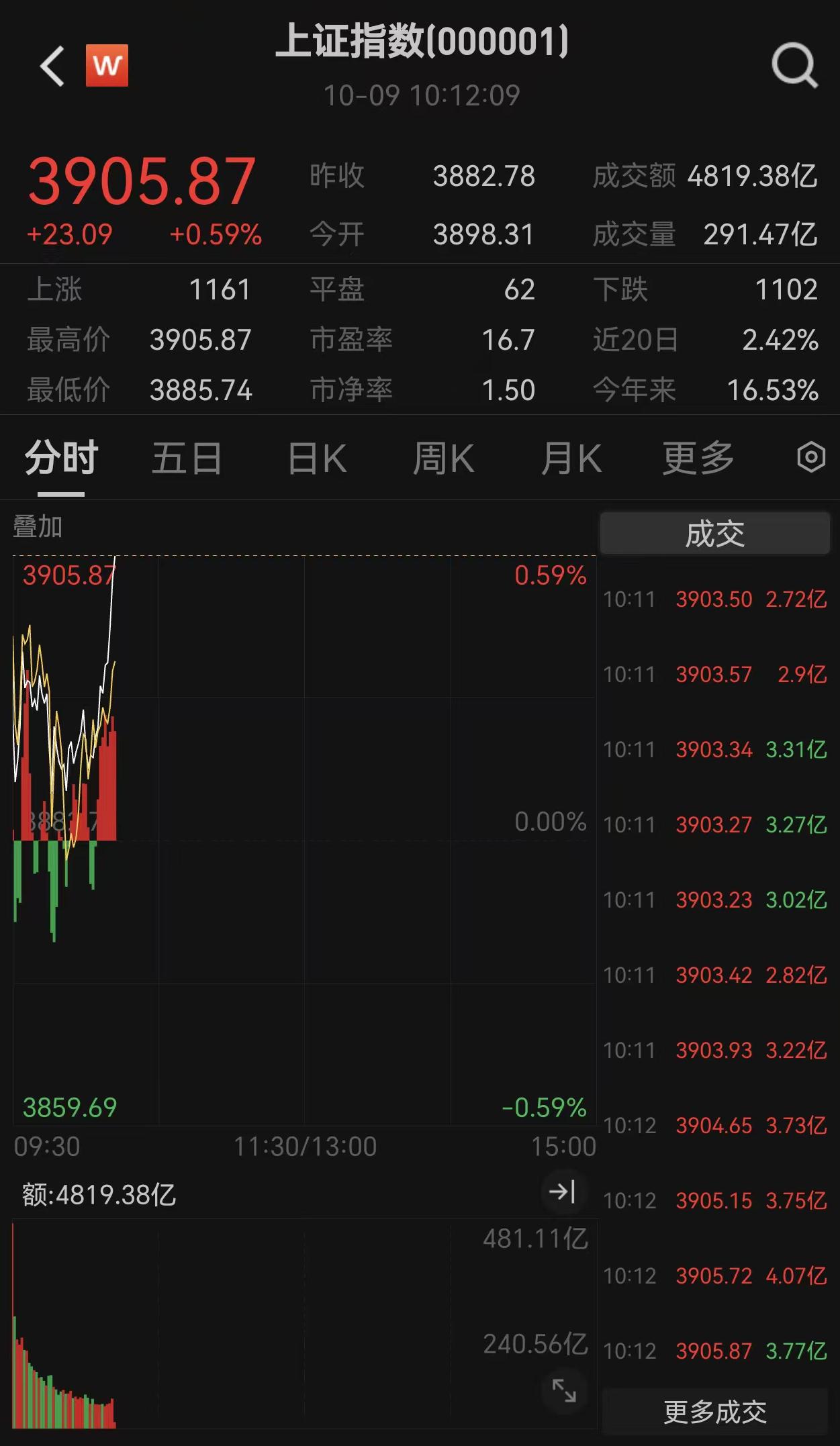 【沪指突破3900点】截至发稿时,上证指数站上3900点,为2015年8月以来首次,最新报3905.87点,涨0.59%。(中新经纬APP)